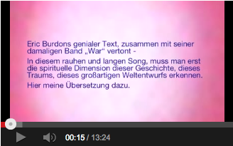 Eric Burdons genialer Text, zusammen mit seiner damaligen Band „War“ vertont – In diesem rauhen und langen Song, muss man erst die spirituelle Dimension dieser Geschichte, dieses Traums, dieses großartigen Weltentwurfs erkennen. Hier der Song, meine Übersetzung und einige Erläuterungen dazu.